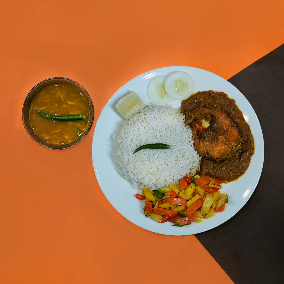 Plain Rice, Fish Curry, Mixed Vegetable, Dal Tadka.